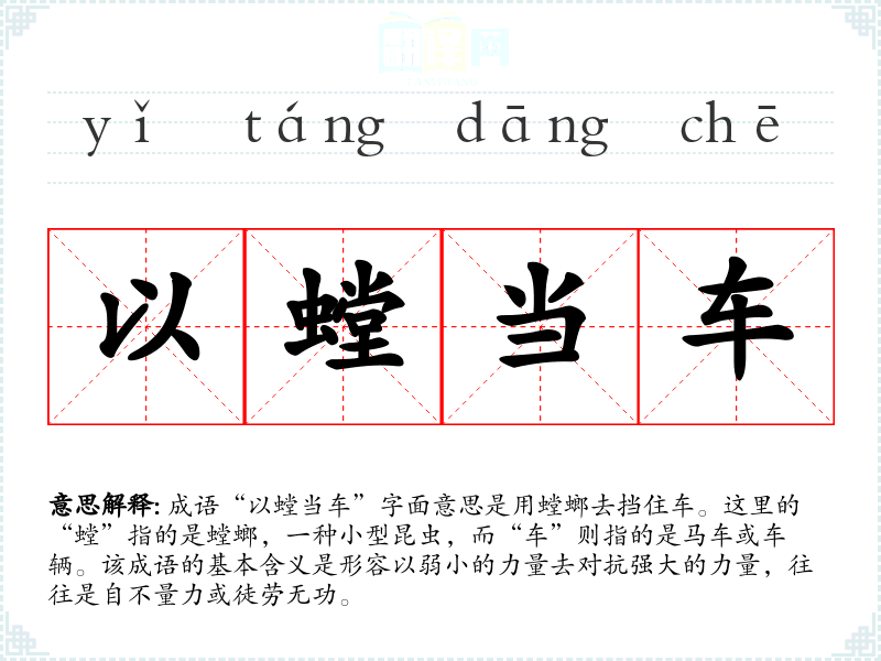 | 以螳当车 | 用螳臂阻挡车轮前进。比喻自不量力。 |