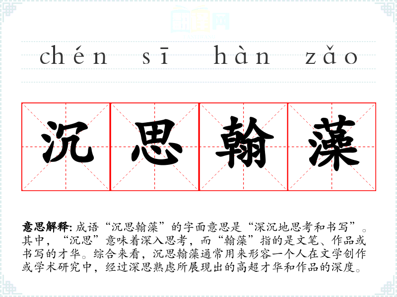 “沉思翰藻”在传统文化中常常与文人精神相结合,强调了对文字和思想的重视。在现代社会,这个成语依然适用,尤其在强调学术研究、文学创作和深度思考的场合中,能够体现出一种对知识和文化的尊重。