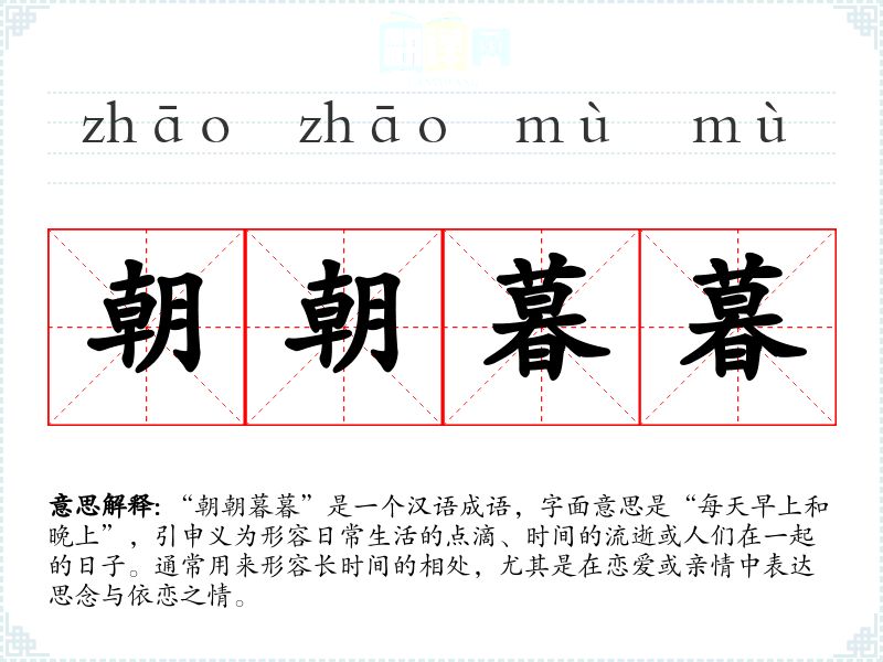“朝朝暮暮”是一个汉语成语,字面意思是“每天早上和晚上”,引申义为形容日常生活的点滴、时间的流逝或人们在一起的日子。通常用来形容长时间的相处,尤其是在恋爱或亲情中表达思念与依恋之情。