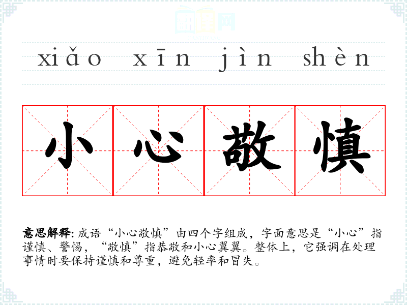 成语“小心敬慎”由四个字组成,字面意思是“小心”指谨慎、警惕,“敬慎”指恭敬和小心翼翼。整体上,它强调在处理事情时要保持谨慎和尊重,避免轻率和冒失。