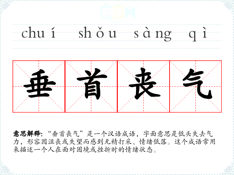 “垂首丧气”是一个汉语成语,字面意思是低头失去气力,形容因沮丧或失望而感到无精打采、情绪低落。这个成语常用来描述一个人在面对困境或挫折时的情绪状态。