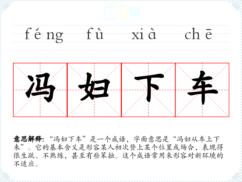 - 日常对话:朋友见面时,某人第一次参加聚会或活动,可能会用“你就像冯妇下车一样”来调侃。