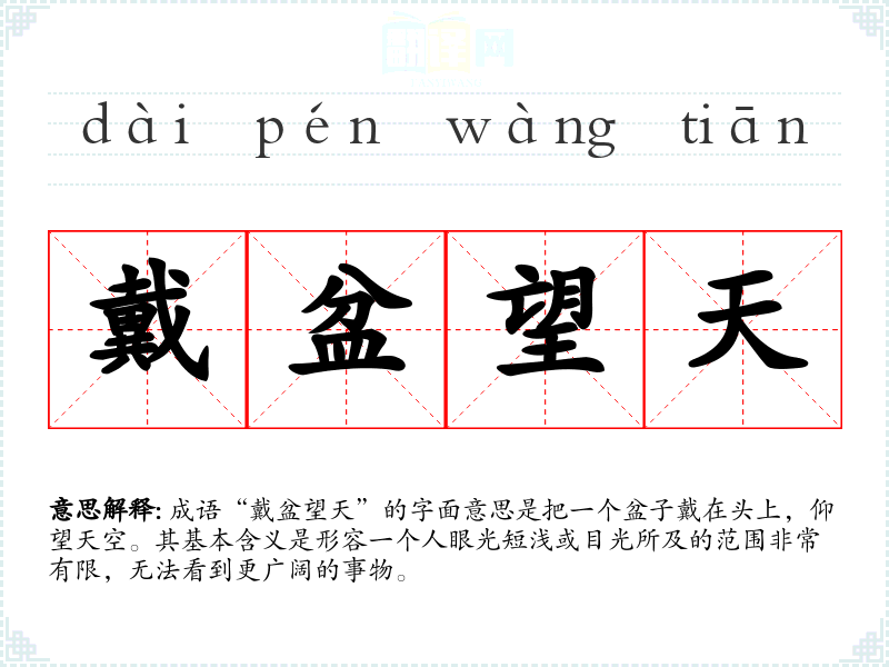成语“戴盆望天”的字面意思是把一个盆子戴在头上,仰望天空。其基本含义是形容一个人眼光短浅或目光所及的范围非常有限,无法看到更广阔的事物。