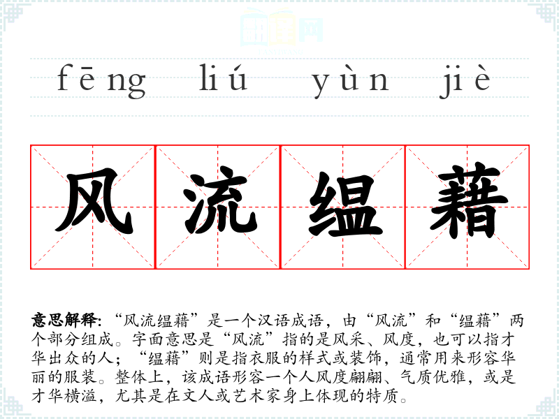 在其他文化中,类似的表达可以是“charming and talented”或“elegant and gifted”,但通常不会有一个与“风流缊藉”完全相同的成语。西方文化中对文人雅士的描述往往更加侧重于个人成就,而不一定强调外在的风采。
