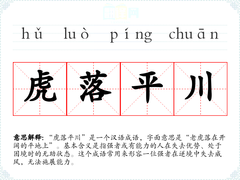 | 虎落平川 | 平川:地势平坦的地方。老虎离开自己称王称霸的深山老林,落到了平地上。比喻有权有势或有实力者失去了自己的权势或优势。 |