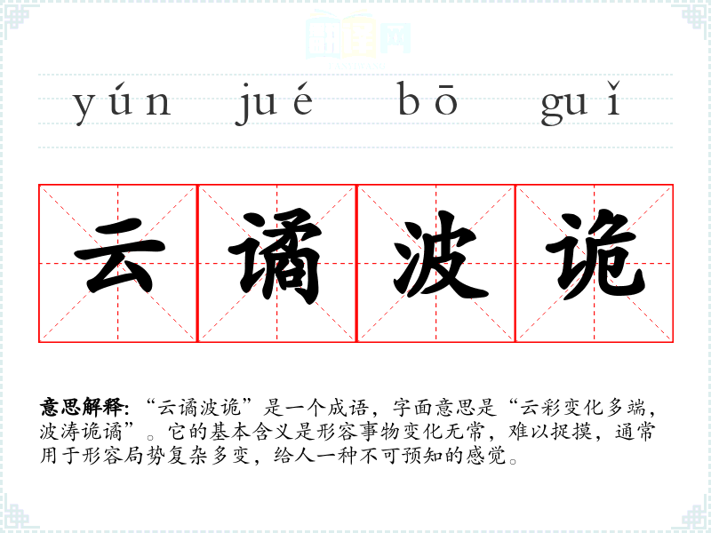 | 云谲波诡 | 谲:怪异;诡:变化多。好像云彩和水波那样,形态不可捉摸。原形容房屋构造就象云彩、波浪一样千姿百态。后多形容事物变幻莫测。 |