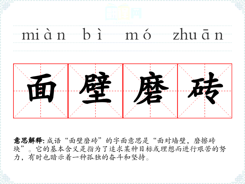 成语“面壁磨砖”的字面意思是“面对墙壁,磨擦砖块”。它的基本含义是指为了追求某种目标或理想而进行艰苦的努力,有时也暗示着一种孤独的奋斗和坚持。