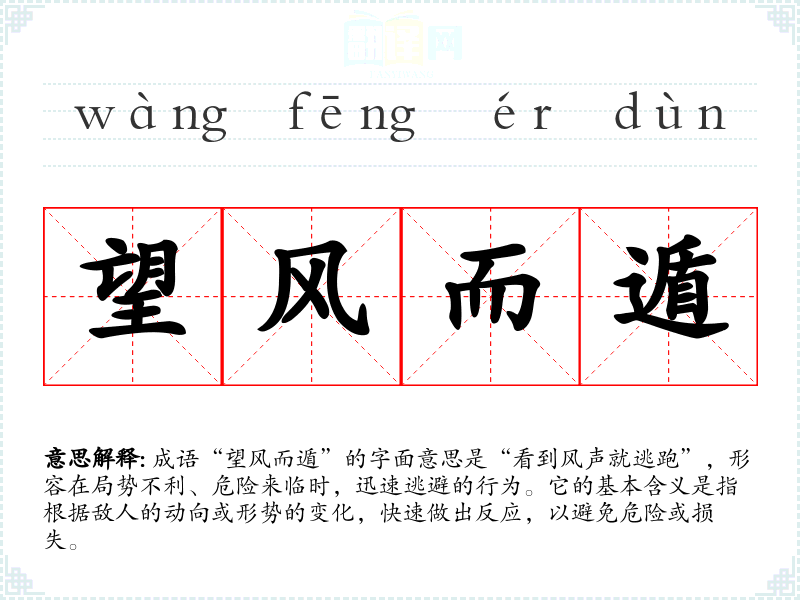 成语“望风而遁”的字面意思是“看到风声就逃跑”,形容在局势不利、危险来临时,迅速逃避的行为。它的基本含义是指根据敌人的动向或形势的变化,快速做出反应,以避免危险或损失。