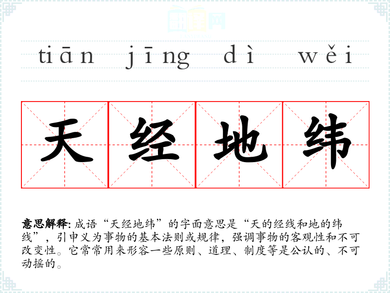 成语“天经地纬”的字面意思是“天的经线和地的纬线”,引申义为事物的基本法则或规律,强调事物的客观性和不可改变性。它常常用来形容一些原则、道理、制度等是公认的、不可动摇的。