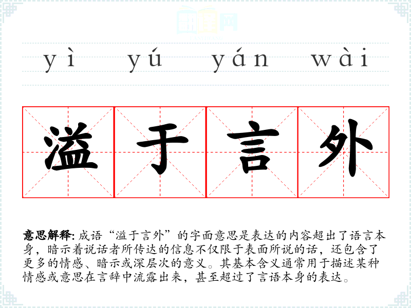 成语“溢于言外”的字面意思是表达的内容超出了语言本身,暗示着说话者所传达的信息不仅限于表面所说的话,还包含了更多的情感、暗示或深层次的意义。其基本含义通常用于描述某种情感或意思在言辞中流露出来,甚至超过了言语本身的表达。