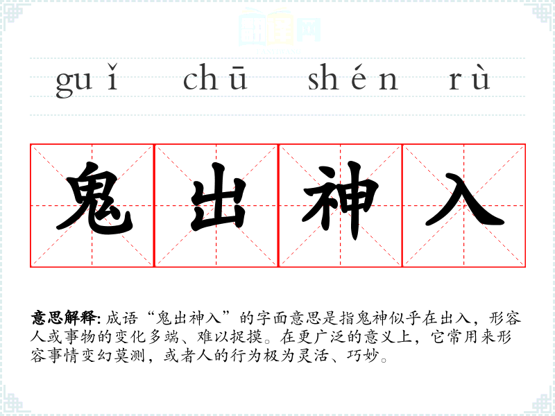 成语“鬼出神入”的字面意思是指鬼神似乎在出入,形容人或事物的变化多端、难以捉摸。在更广泛的意义上,它常用来形容事情变幻莫测,或者人的行为极为灵活、巧妙。
