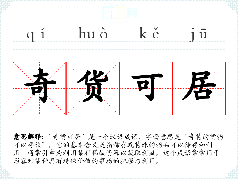 “奇货可居”是一个汉语成语,字面意思是“奇特的货物可以存放”。它的基本含义是指稀有或特殊的物品可以储存和利用,通常引申为利用某种稀缺资源以获取利益。这个成语常常用于形容对某种具有特殊价值的事物的把握与利用。