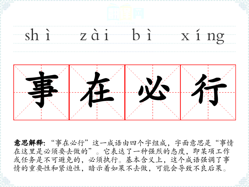 “事在必行”这一成语由四个字组成,字面意思是“事情在这里是必须要去做的”。它表达了一种强烈的态度,即某项工作或任务是不可避免的,必须执行。基本含义上,这个成语强调了事情的重要性和紧迫性,暗示着如果不去做,可能会导致不良后果。
