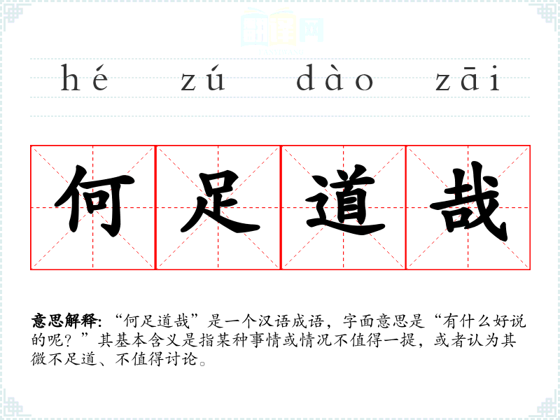“何足道哉”是一个汉语成语,字面意思是“有什么好说的呢?”其基本含义是指某种事情或情况不值得一提,或者认为其微不足道、不值得讨论。