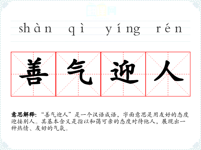 “善气迎人”是一个汉语成语,字面意思是用友好的态度迎接别人。其基本含义是指以和蔼可亲的态度对待他人,展现出一种热情、友好的气氛。