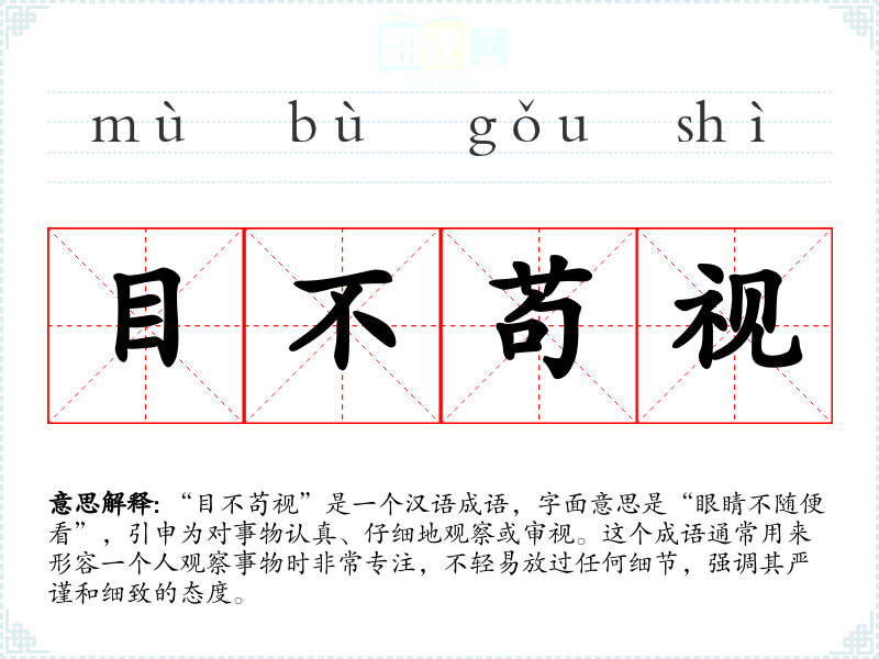 在英语中,有类似于“pay close attention”或“be meticulous”的表达,虽然意思相近,但语境和文化背景可能有所不同。在西方文化中,强调效率的同时,也重视细节和质量,这与“目不苟视”有相似之处。