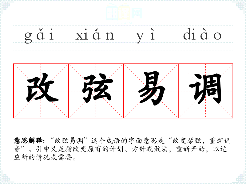 “改弦易调”这个成语的字面意思是“改变琴弦,重新调音”。引申义是指改变原有的计划、方针或做法,重新开始,以适应新的情况或需要。