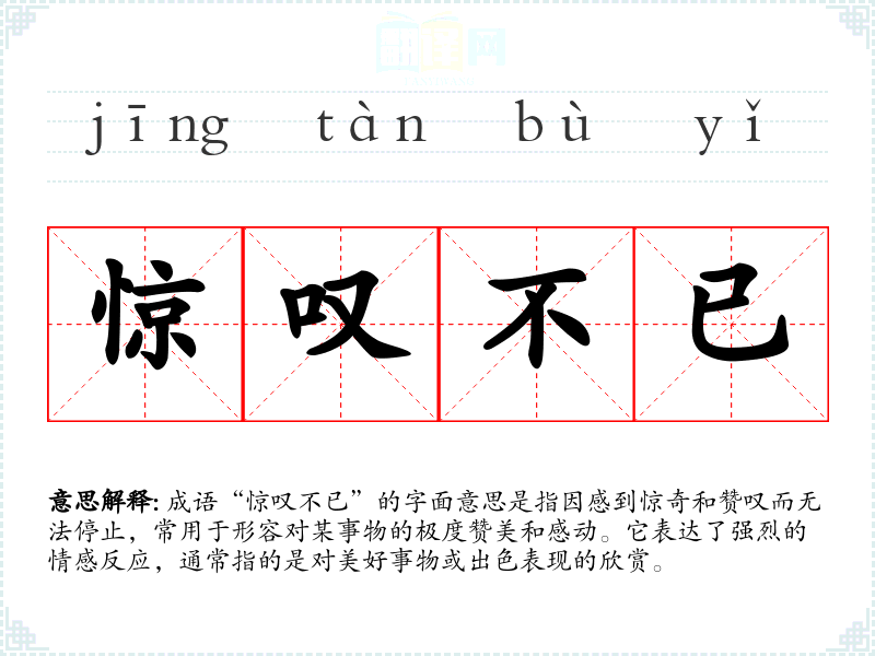 “惊叹不已”的具体来源并无明确的历史典故,但其构成的“惊叹”二字是古汉语中常用的表达方式,体现了对事物的惊奇和赞美之情。可以推测,这个成语在汉语的演变过程中逐渐形成,并被广泛使用于各种文学和口语表达中。