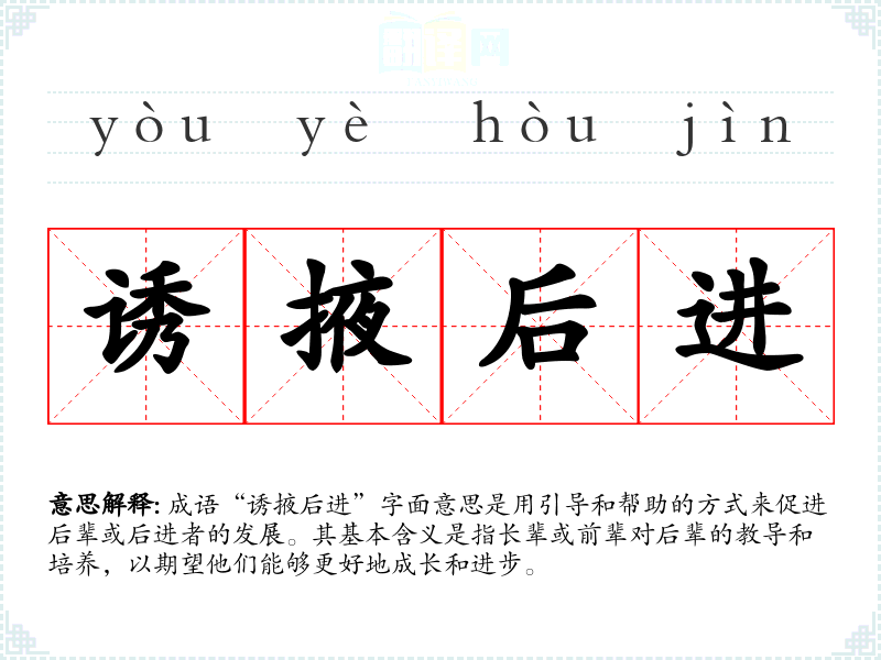 “诱掖后进”出自《后汉书·荀彧传》,其中提到“诱掖后进”,意指在教育和引导后进者方面的责任和作用。这一成语反映了古代对教育和传承的重要性,强调了前辈对后辈的关心与支持。