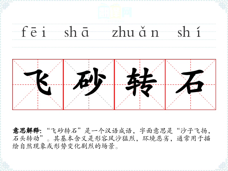 - 文学作品:在描绘沙漠、暴风天气等自然环境时,作家会用“飞砂转石”来增强画面感。