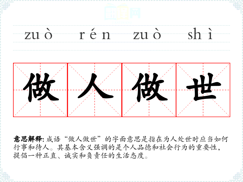 成语“做人做世”的字面意思是指在为人处世时应当如何行事和待人。其基本含义强调的是个人品德和社会行为的重要性,提倡一种正直、诚实和负责任的生活态度。