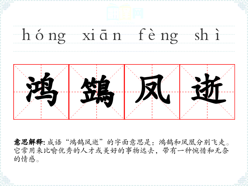 成语“鸿鹄凤逝”的字面意思是:鸿鹄和凤凰分别飞走。它常用来比喻优秀的人才或美好的事物远去,带有一种惋惜和无奈的情感。