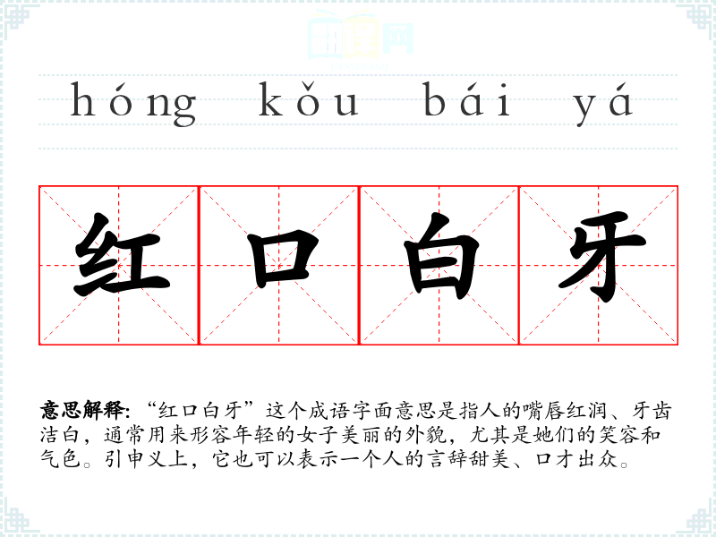 “红口白牙”这个成语字面意思是指人的嘴唇红润、牙齿洁白,通常用来形容年轻的女子美丽的外貌,尤其是她们的笑容和气色。引申义上,它也可以表示一个人的言辞甜美、口才出众。