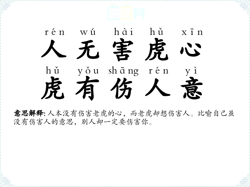 人本没有伤害老虎的心,而老虎却想伤害人。比喻自己虽没有伤害人的意思,别人却一定要伤害你。 |