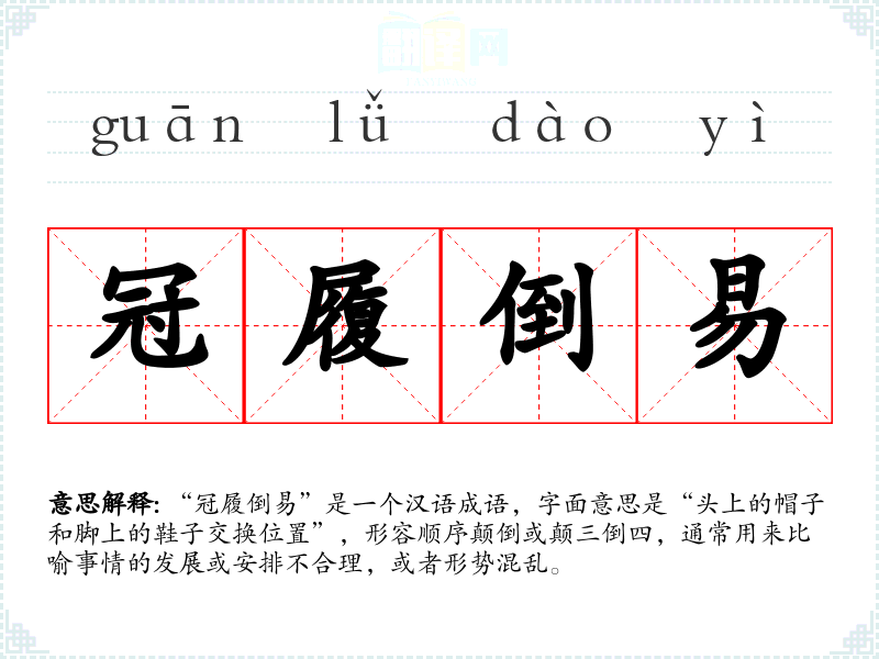 “冠履倒易”是一个汉语成语,字面意思是“头上的帽子和脚上的鞋子交换位置”,形容顺序颠倒或颠三倒四,通常用来比喻事情的发展或安排不合理,或者形势混乱。