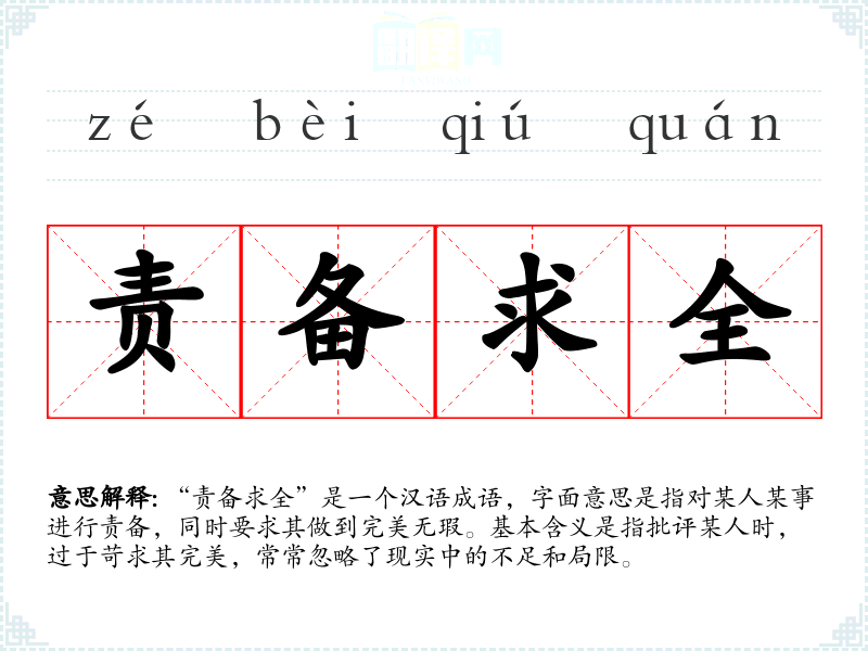 “责备求全”是一个汉语成语,字面意思是指对某人某事进行责备,同时要求其做到完美无瑕。基本含义是指批评某人时,过于苛求其完美,常常忽略了现实中的不足和局限。