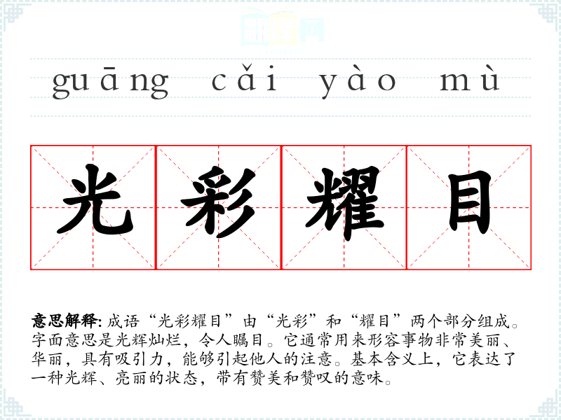 在**文化中,美的事物往往与光彩、辉煌相联系。因此,“光彩耀目”不仅可以用来形容外表的华丽,还可以象征一个人的成就、品格等方面的光辉。在现代社会,随着传媒和时尚文化的发展,这个成语逐渐被广泛应用于时尚、艺术和商业等领域,反映了人们对美与成功的追求。