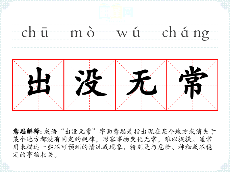 成语“出没无常”字面意思是指出现在某个地方或消失于某个地方都没有固定的规律,形容事物变化无常,难以捉摸。通常用来描述一些不可预测的情况或现象,特别是与危险、神秘或不稳定的事物相关。