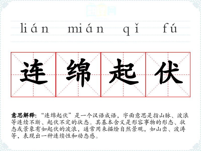 “连绵起伏”是一个汉语成语,字面意思是指山脉、波浪等连续不断、起伏不定的状态。其基本含义是形容事物的形态、状态或景象有如起伏的波浪,通常用来描绘自然景观,如山峦、波涛等,表现出一种连续性和动态感。