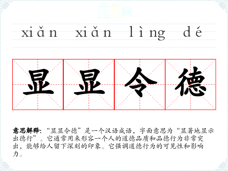 “显显令德”并没有明确的历史来源或特定的文学出处,但其构成的词汇在**传统文化中有着深厚的根基。道德伦理在儒家思想中占据核心地位,强调在社会中应展现良好的品德,以影响他人。成语的形成与这一文化背景有密切关系。
