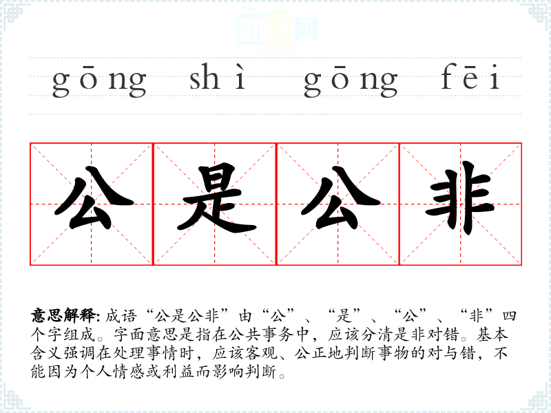 成语“公是公非”由“公”、“是”、“公”、“非”四个字组成。字面意思是指在公共事务中,应该分清是非对错。基本含义强调在处理事情时,应该客观、公正地判断事物的对与错,不能因为个人情感或利益而影响判断。