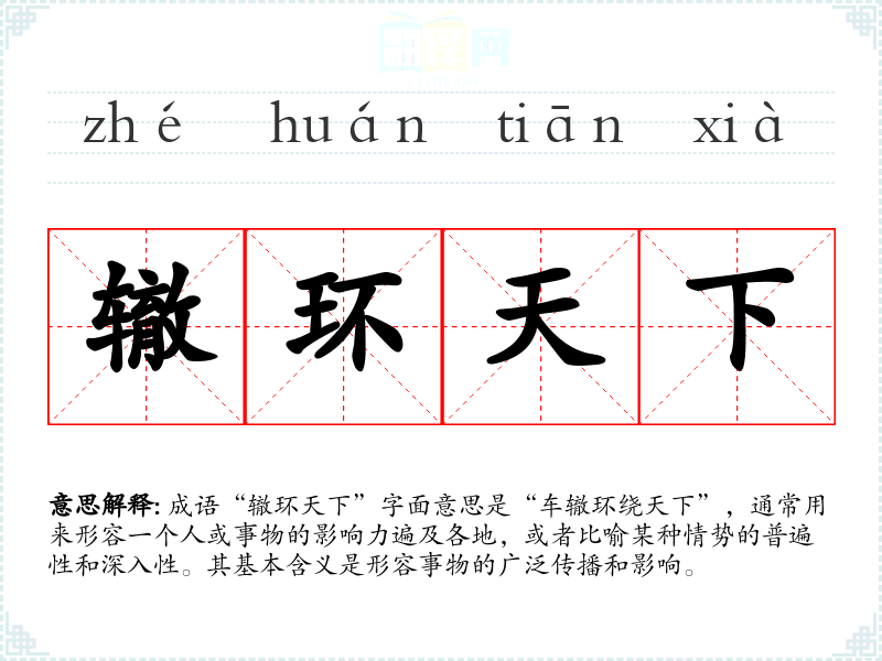 成语“辙环天下”字面意思是“车辙环绕天下”,通常用来形容一个人或事物的影响力遍及各地,或者比喻某种情势的普遍性和深入性。其基本含义是形容事物的广泛传播和影响。