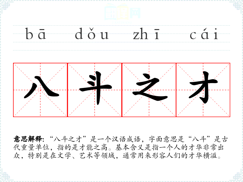 “八斗之才”是一个汉语成语,字面意思是“八斗”是古代重量单位,指的是才能之高。基本含义是指一个人的才华非常出众,特别是在文学、艺术等领域,通常用来形容人们的才华横溢。