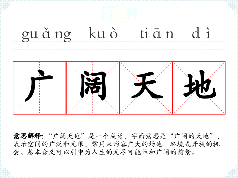 | 广阔天地 | 指可以发挥作用做出成就的广大领域。 |