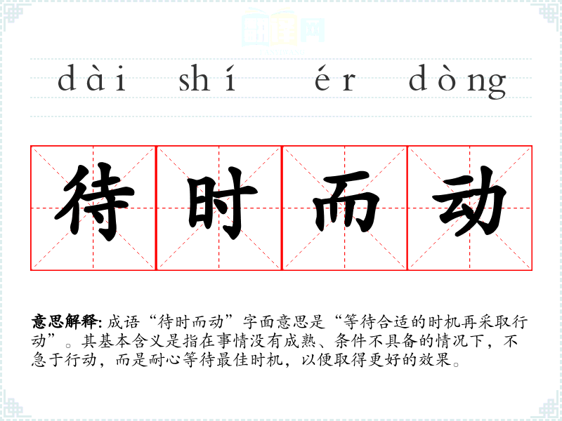 成语“待时而动”字面意思是“等待合适的时机再采取行动”。其基本含义是指在事情没有成熟、条件不具备的情况下,不急于行动,而是耐心等待最佳时机,以便取得更好的效果。
