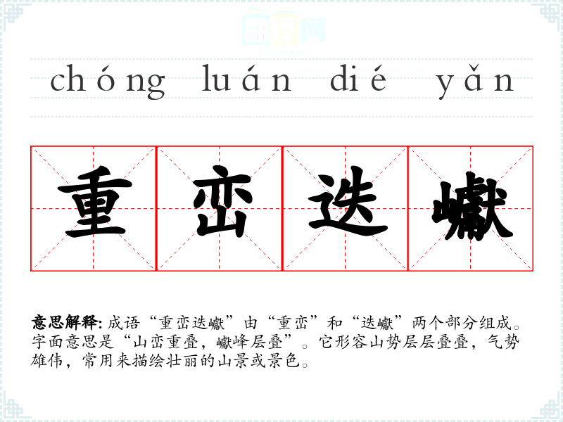 成语“重峦迭巘”由“重峦”和“迭巘”两个部分组成。字面意思是“山峦重叠,巘峰层叠”。它形容山势层层叠叠,气势雄伟,常用来描绘壮丽的山景或景色。