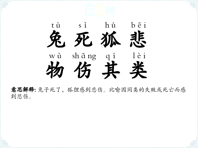 兔子死了,狐狸感到悲伤。比喻因同类的失败或死亡而感到悲伤。 |