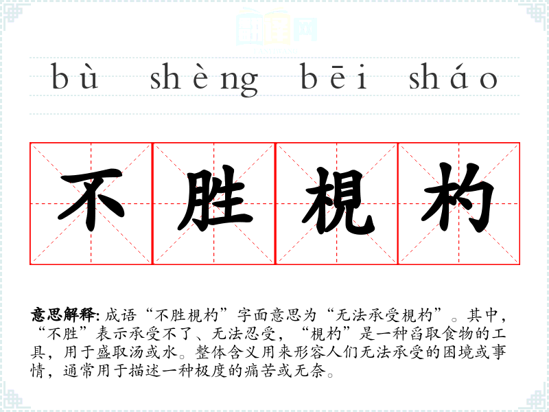 成语“不胜梘杓”字面意思为“无法承受梘杓”。其中,“不胜”表示承受不了、无法忍受,“梘杓”是一种舀取食物的工具,用于盛取汤或水。整体含义用来形容人们无法承受的困境或事情,通常用于描述一种极度的痛苦或无奈。