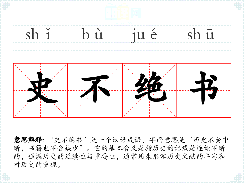“史不绝书”是一个汉语成语,字面意思是“历史不会中断,书籍也不会缺少”。它的基本含义是指历史的记载是连续不断的,强调历史的延续性与重要性,通常用来形容历史文献的丰富和对历史的重视。