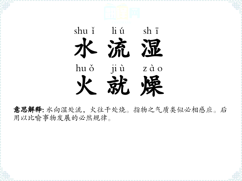 | 水流湿,火就燥 | 水向湿处流,火往干处烧。指物之气质类似必相感应。后用以比喻事物发展的必然规律。 |