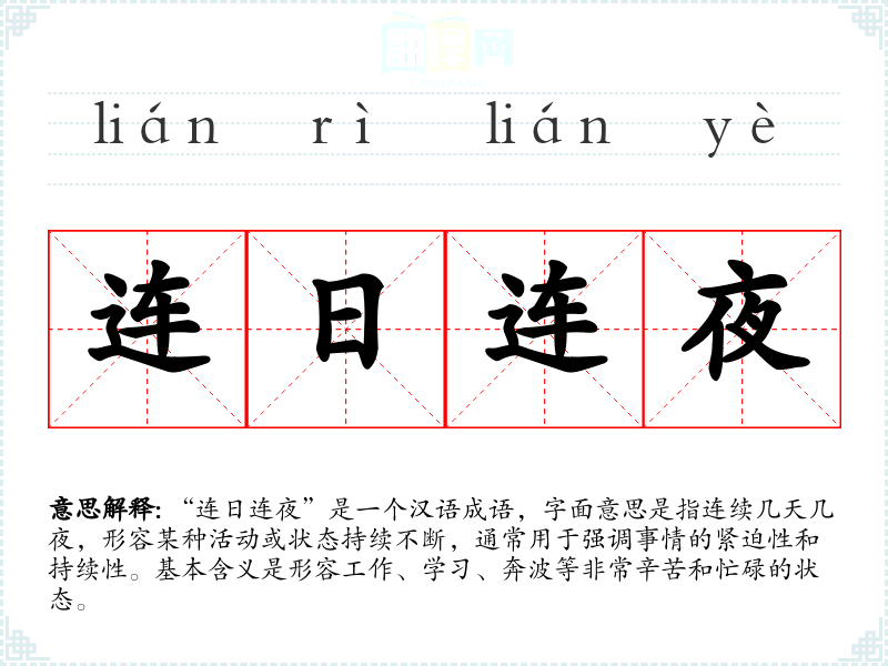 “连日连夜”是一个汉语成语,字面意思是指连续几天几夜,形容某种活动或状态持续不断,通常用于强调事情的紧迫性和持续性。基本含义是形容工作、学习、奔波等非常辛苦和忙碌的状态。