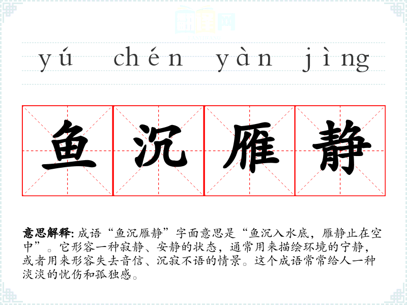 成语“鱼沉雁静”字面意思是“鱼沉入水底,雁静止在空中”。它形容一种寂静、安静的状态,通常用来描绘环境的宁静,或者用来形容失去音信、沉寂不语的情景。这个成语常常给人一种淡淡的忧伤和孤独感。