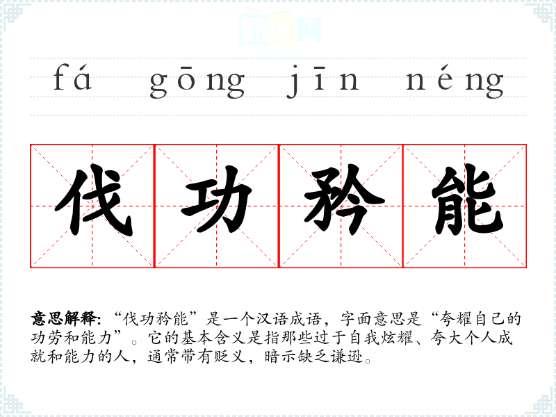 “伐功矜能”是一个汉语成语,字面意思是“夸耀自己的功劳和能力”。它的基本含义是指那些过于自我炫耀、夸大个人成就和能力的人,通常带有贬义,暗示缺乏谦逊。