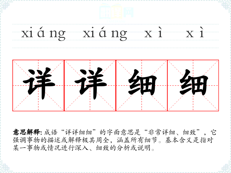 成语“详详细细”的字面意思是“非常详细、细致”,它强调事物的描述或解释极其周全,涵盖所有细节。基本含义是指对某一事物或情况进行深入、细致的分析或说明。