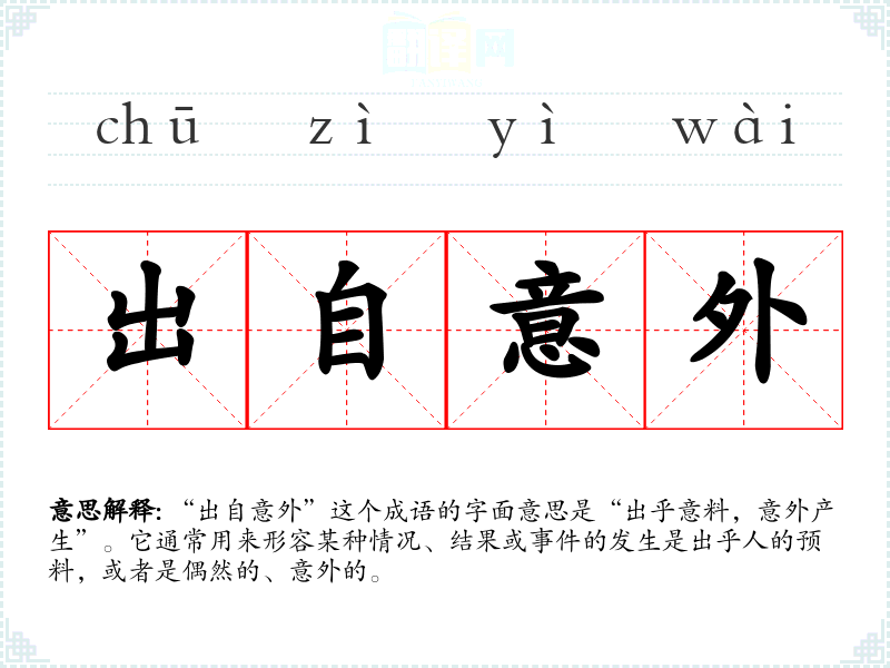 “出自意外”这个成语的字面意思是“出乎意料,意外产生”。它通常用来形容某种情况、结果或**的发生是出乎人的预料,或者是偶然的、意外的。