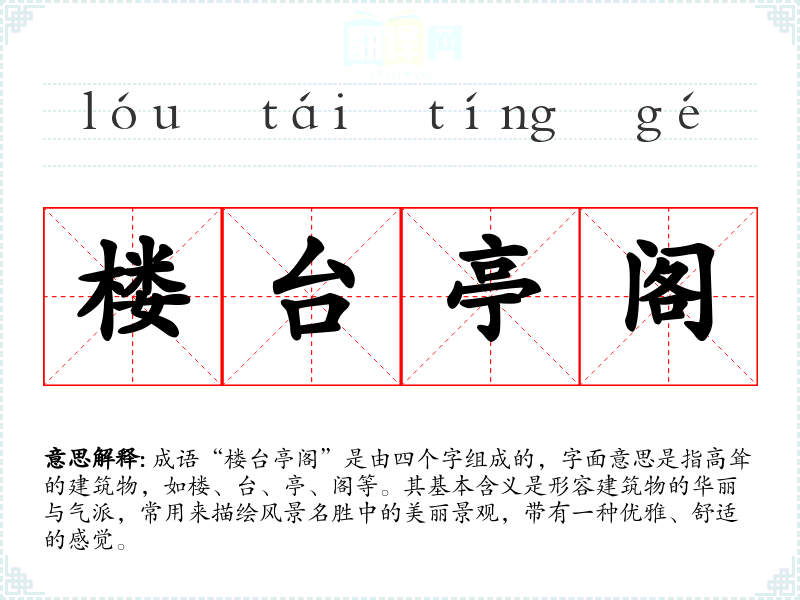 成语“楼台亭阁”是由四个字组成的,字面意思是指高耸的建筑物,如楼、台、亭、阁等。其基本含义是形容建筑物的华丽与气派,常用来描绘风景名胜中的美丽景观,带有一种优雅、舒适的感觉。